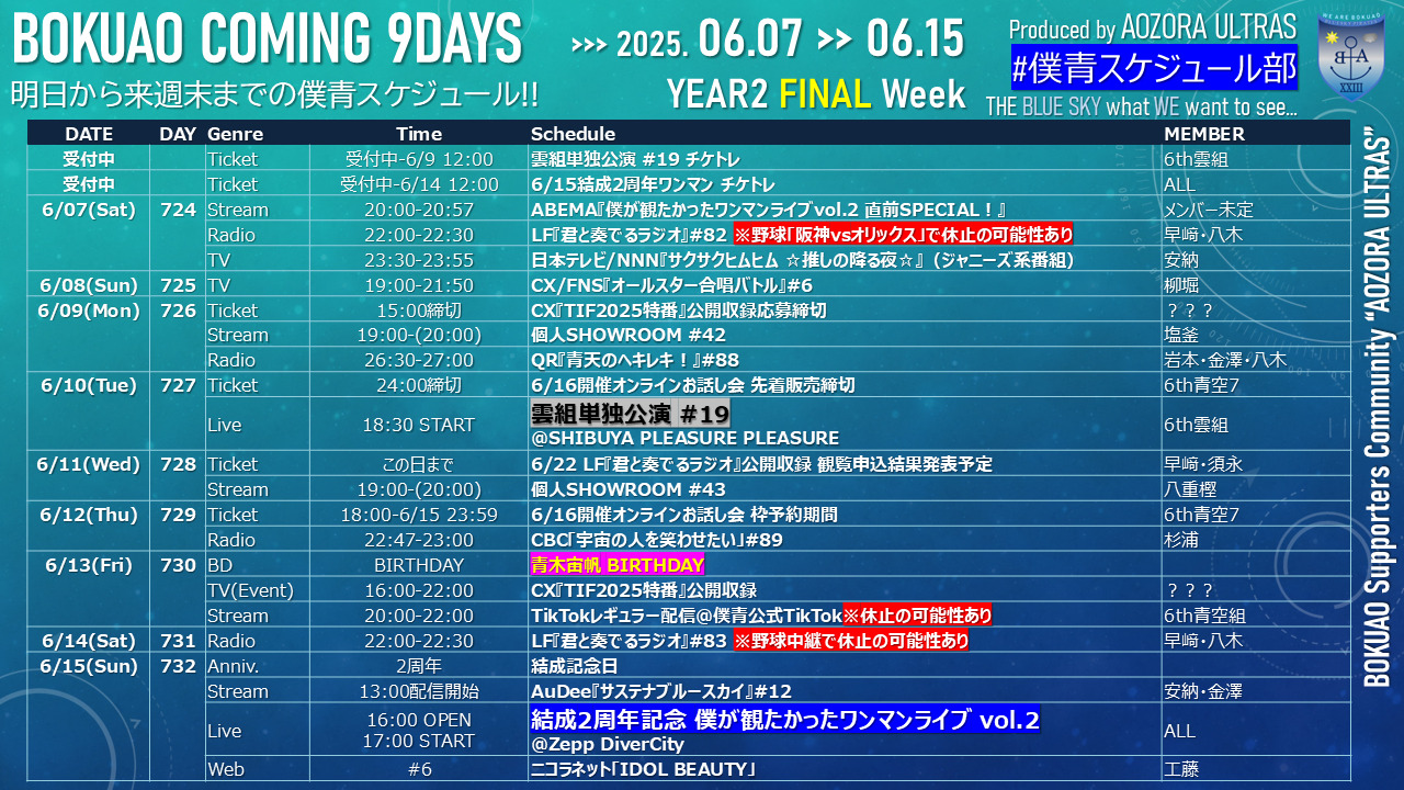 【僕青向こう1週間】BOKUAO COMING 9DAYS!! 6/7-6/15【青木BD&結成2周年!】※6/7更新