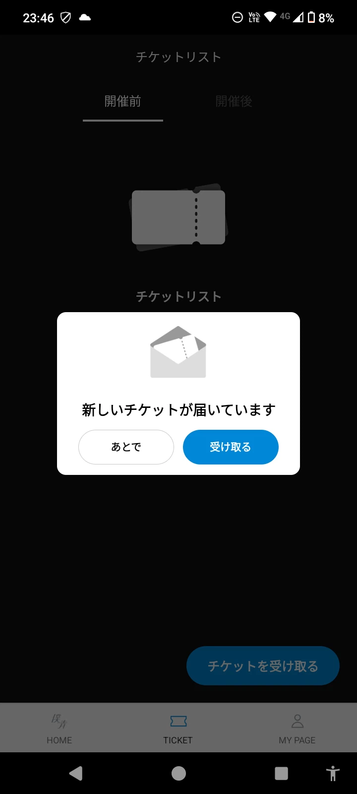 発券期間中だと「新しいチケットが届いています」というダイアログが出てくるので、「受け取る」をタップ。