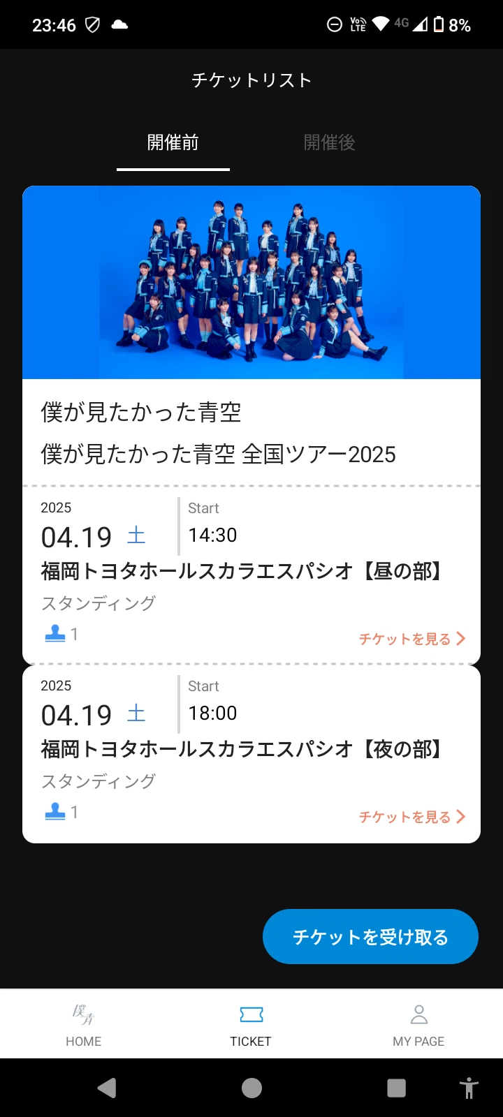 該当公演チケットが「開催前」のタブに登場。これで無事受け取れました。