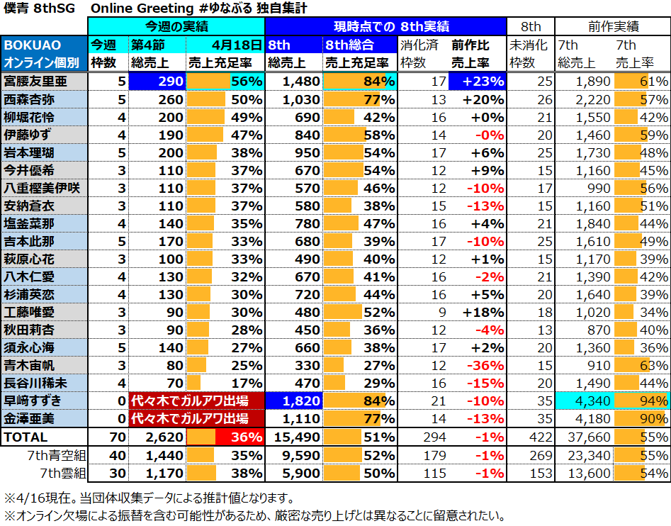 今節も引き続きライブツアー中ということもあり、購買意欲の全体的な減衰がデータからも見て取れている。売上が落ちるのは決して良いことではないのだが、過密日程の中で持続可能なオタク活動をしていくためには無理は禁物である。自分のできる範囲で、無理のない応援活動を頑張っていただきたいところ。
